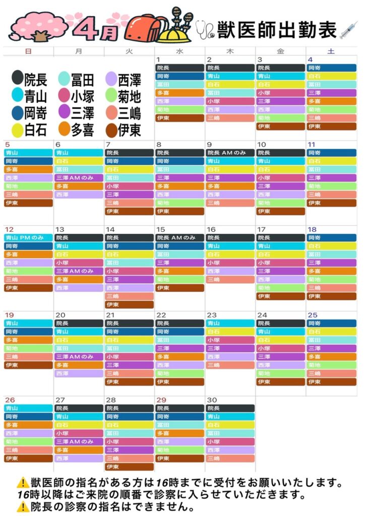 4月獣医シフトのお知らせ - タルタ動物病院